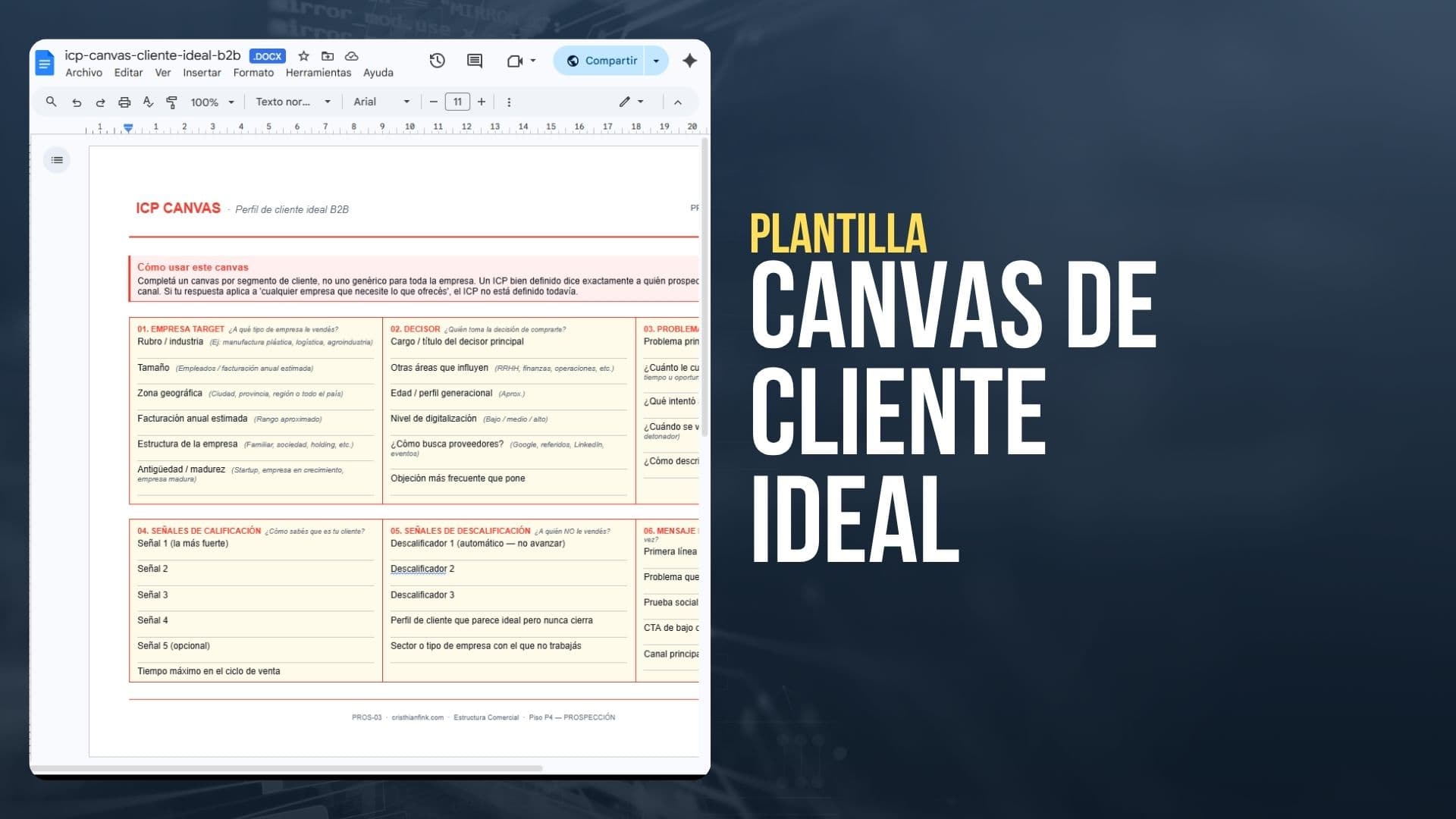 1. Mi ICP en términos operativos — Basándote en lo que describí, definí mi cliente ideal en cinco dimensiones: industria o sector, tamaño de empresa, rol del decisor, señal de que está listo para comprar y señal de descarte temprano. Que sea algo que un vendedor pueda chequear en los primeros cinco minutos de investigación.